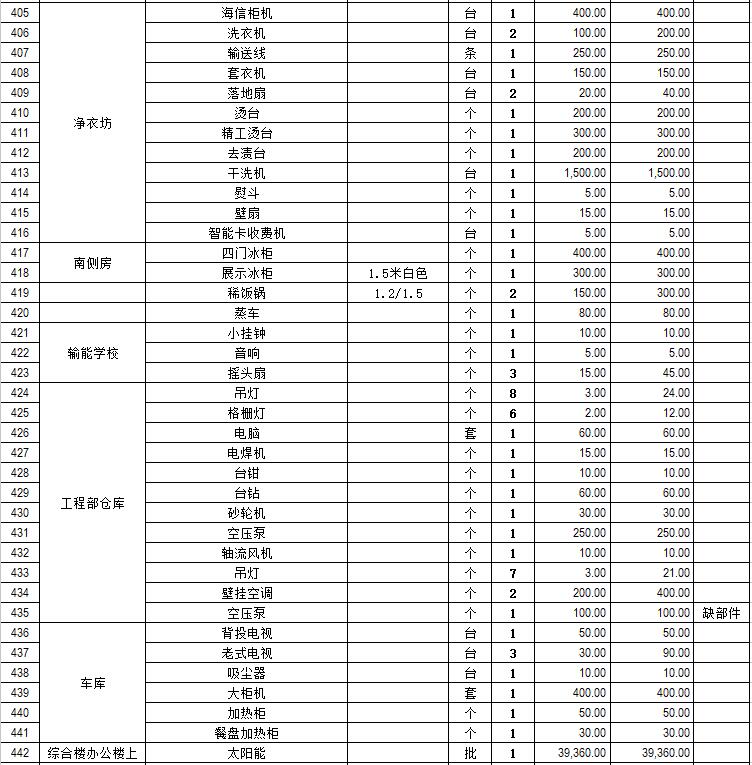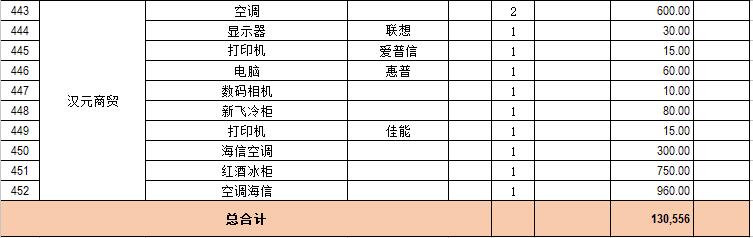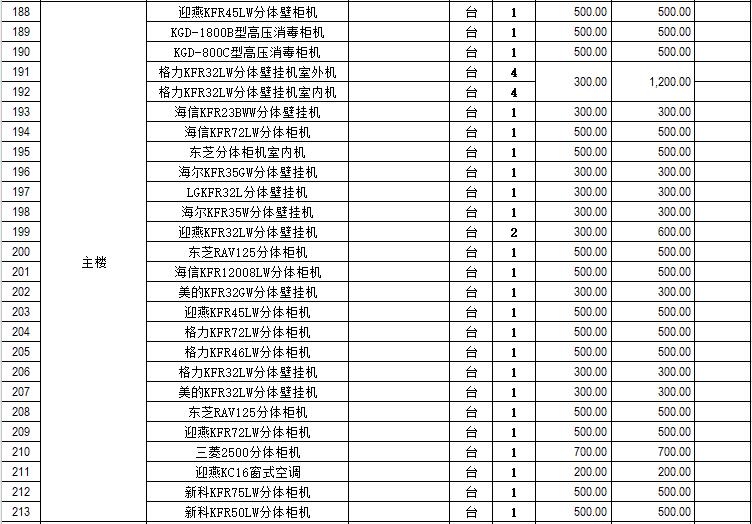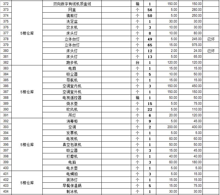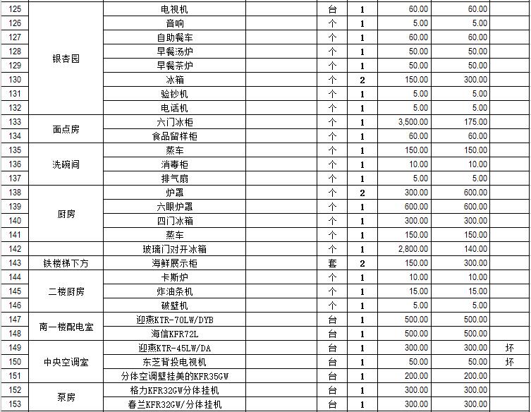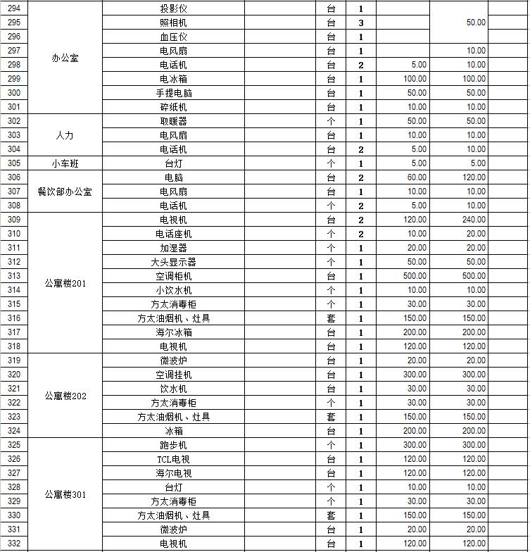 電器設(shè)備主要包含:電視機(jī)、空調(diào)、冰箱、消毒柜、電風(fēng)扇、燈具、電腦、音響設(shè)備、廚房不銹鋼灶具等。