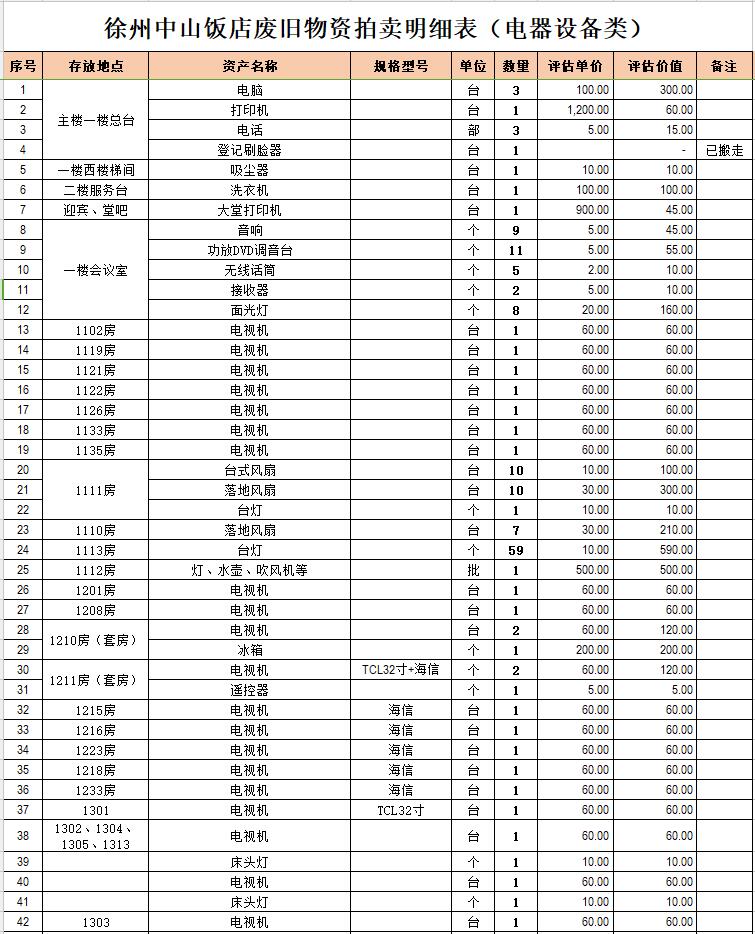 關(guān)注微信公眾號(hào)我公司受委托,定于2021年1月18日10時(shí)在中拍平臺(tái)通過網(wǎng)絡(luò)競拍方式公開拍賣:徐州市中山飯店、漢元商貿(mào)公司廢舊物資一批,主要包括廢舊電器設(shè)備、酒店用具等。
